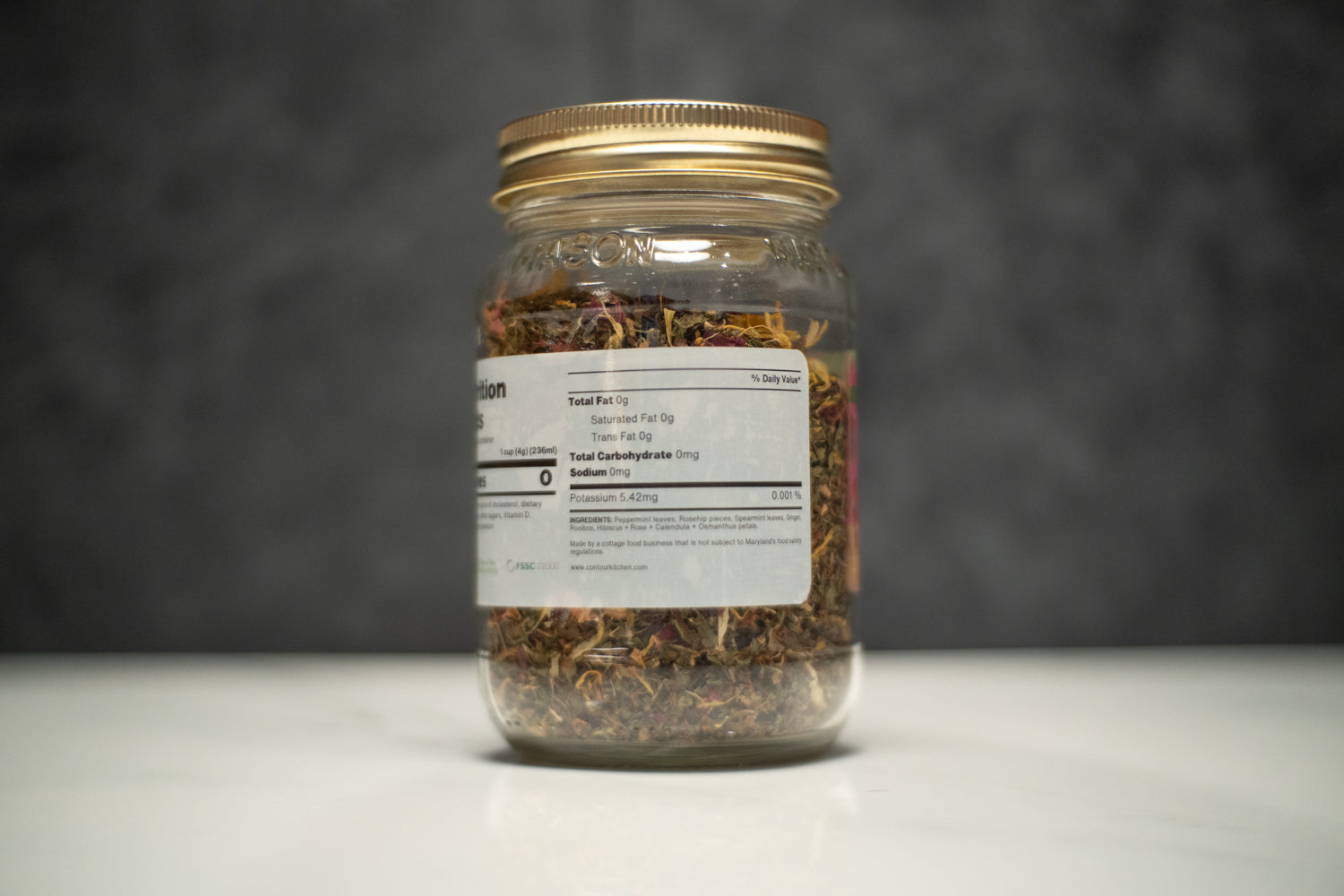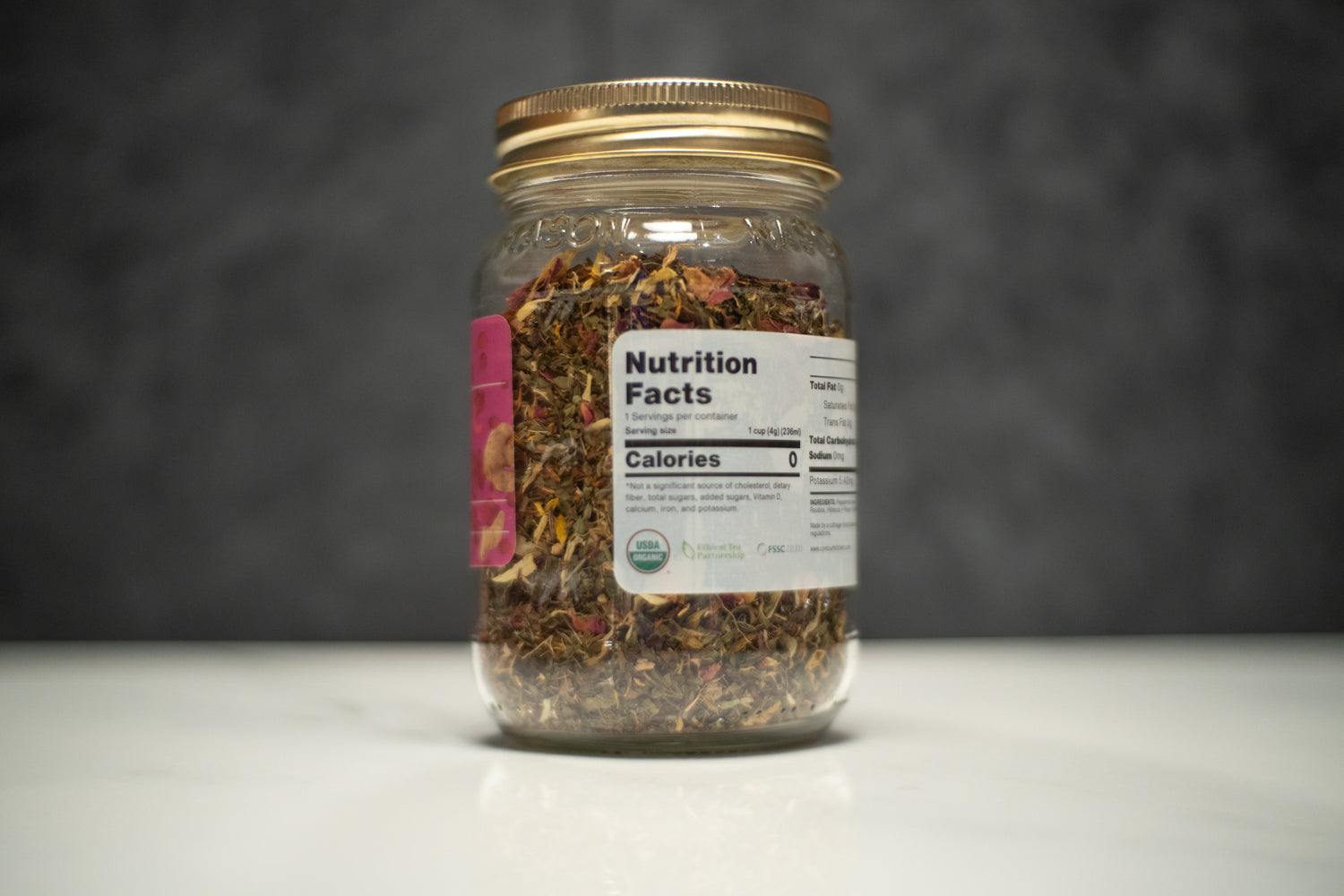 Ingredientes de lujo: Hojas de menta, trozos de rosa mosqueta, hojas de hierbabuena, jengibre, rooibos, hibisco + rosa + caléndula + pétalos de osmanthus.