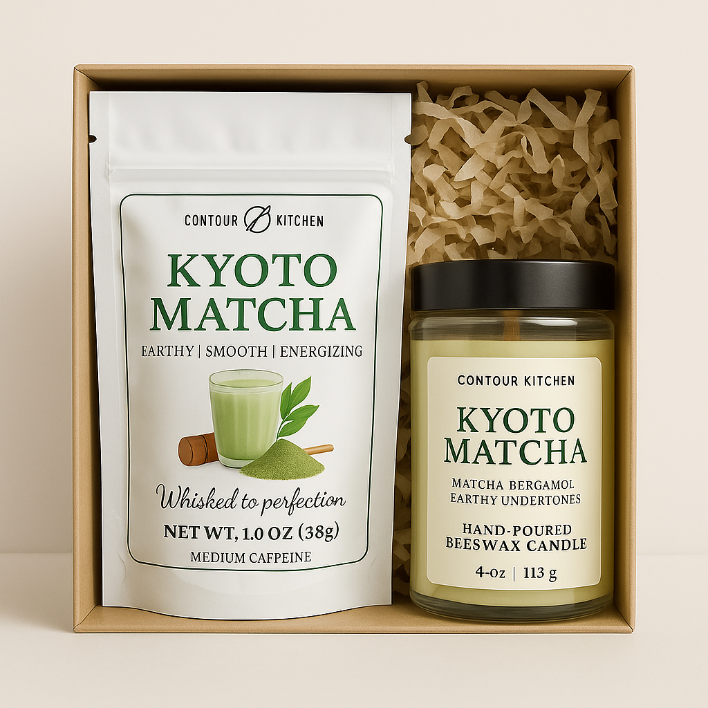 A revitalizing gift set featuring Contour Kitchen’s Kyoto Matcha loose-leaf tea and hand-poured Kyoto Matcha beeswax candle—designed to awaken the senses and bring grounding energy into any space.